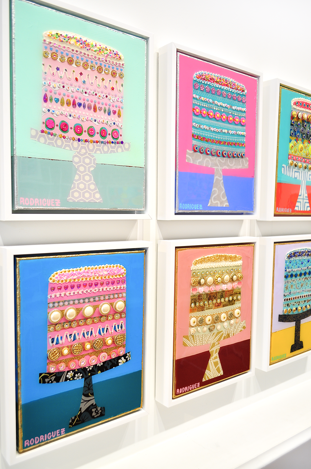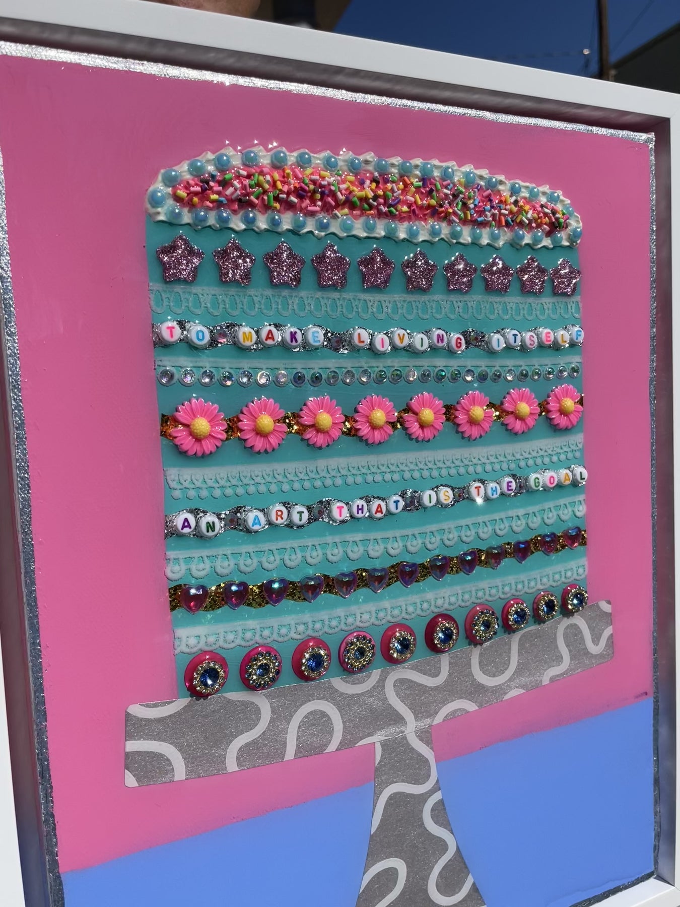 Crafted one layer at a time, each element holds a secret — a memory of wonder, a prayer for joy. Vintage buttons recall how we adorn ourselves for special occasions. Old stamps speak to our longing to stay connected across distance. Glass beads, rhinestones, sprinkles, and other curios shimmer in homage to life’s pure revelry.
