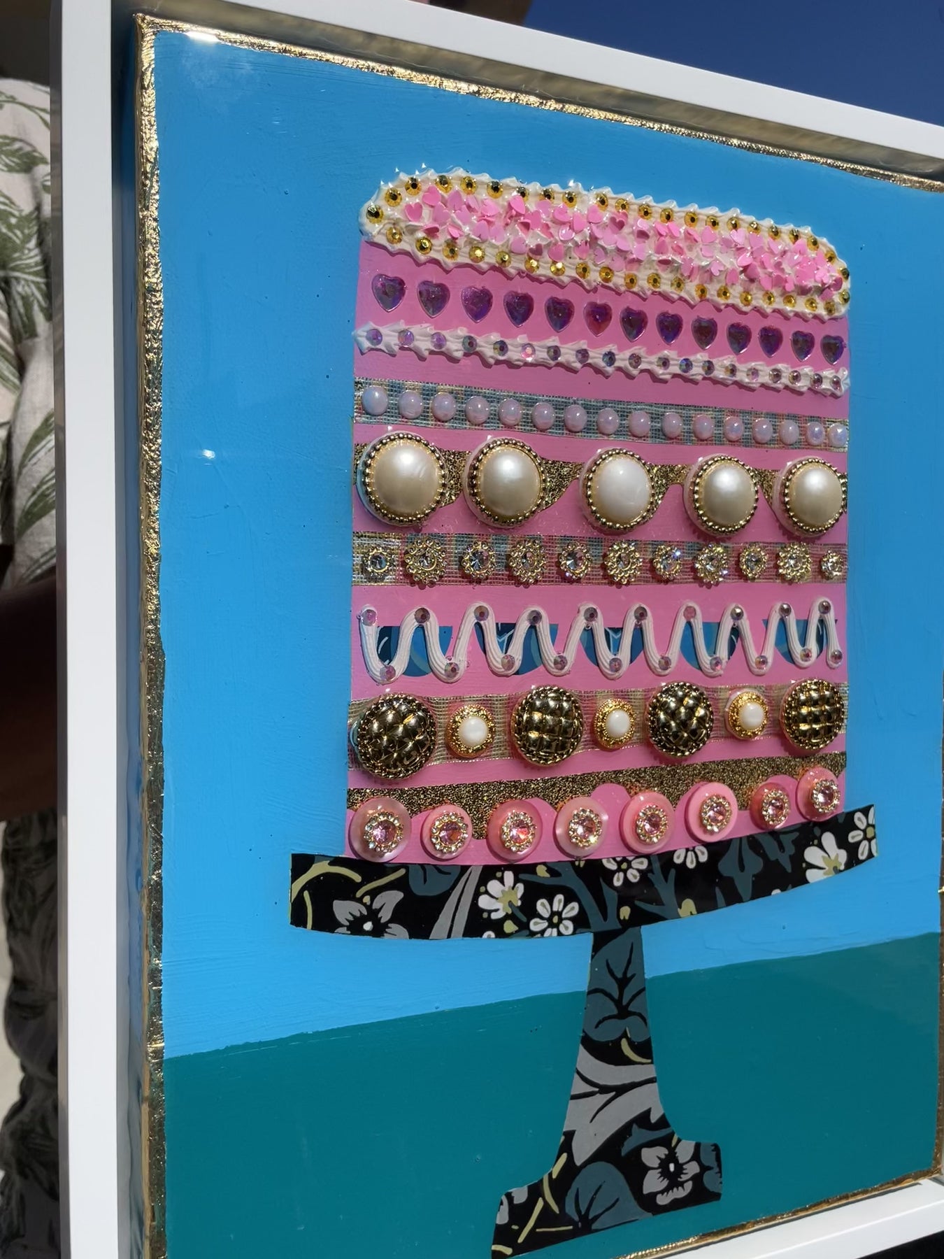 -Mixed media acrylic with vintage buttons, wallpaper collage, glass rhinestones, acrylic rhinestones, acrylic beads, gold leaf edges, glitter and resin on canvas